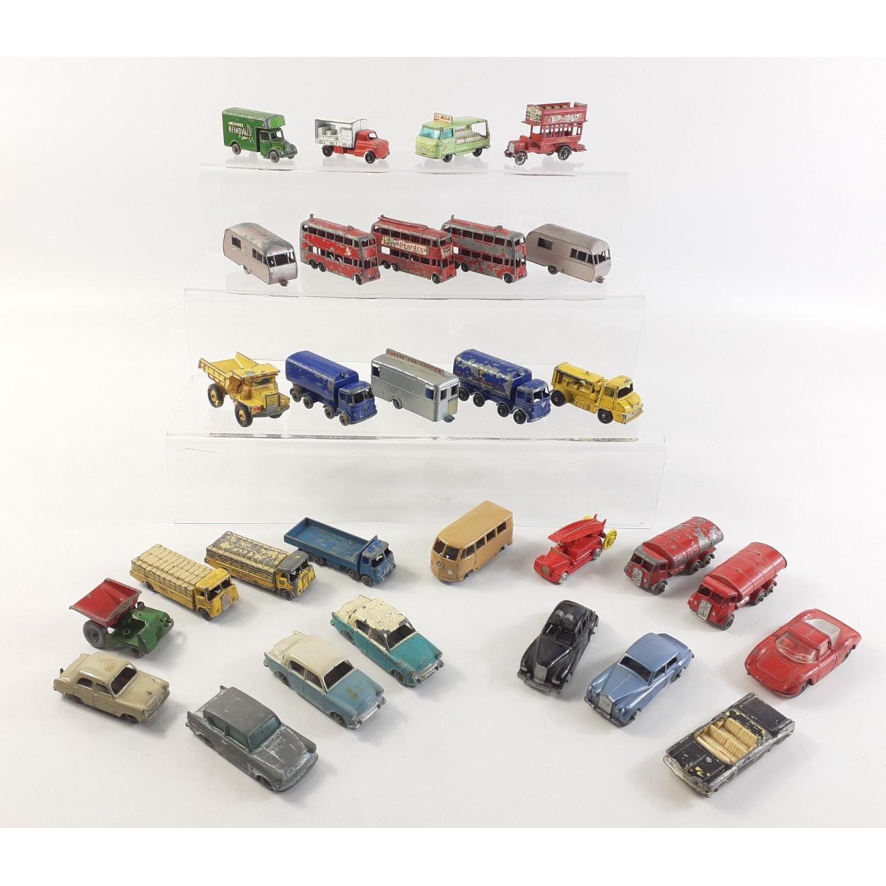 A tin containing a quantity of Lesney Moko Matchbox diecast vehicles in playworn but mainly complete condition.