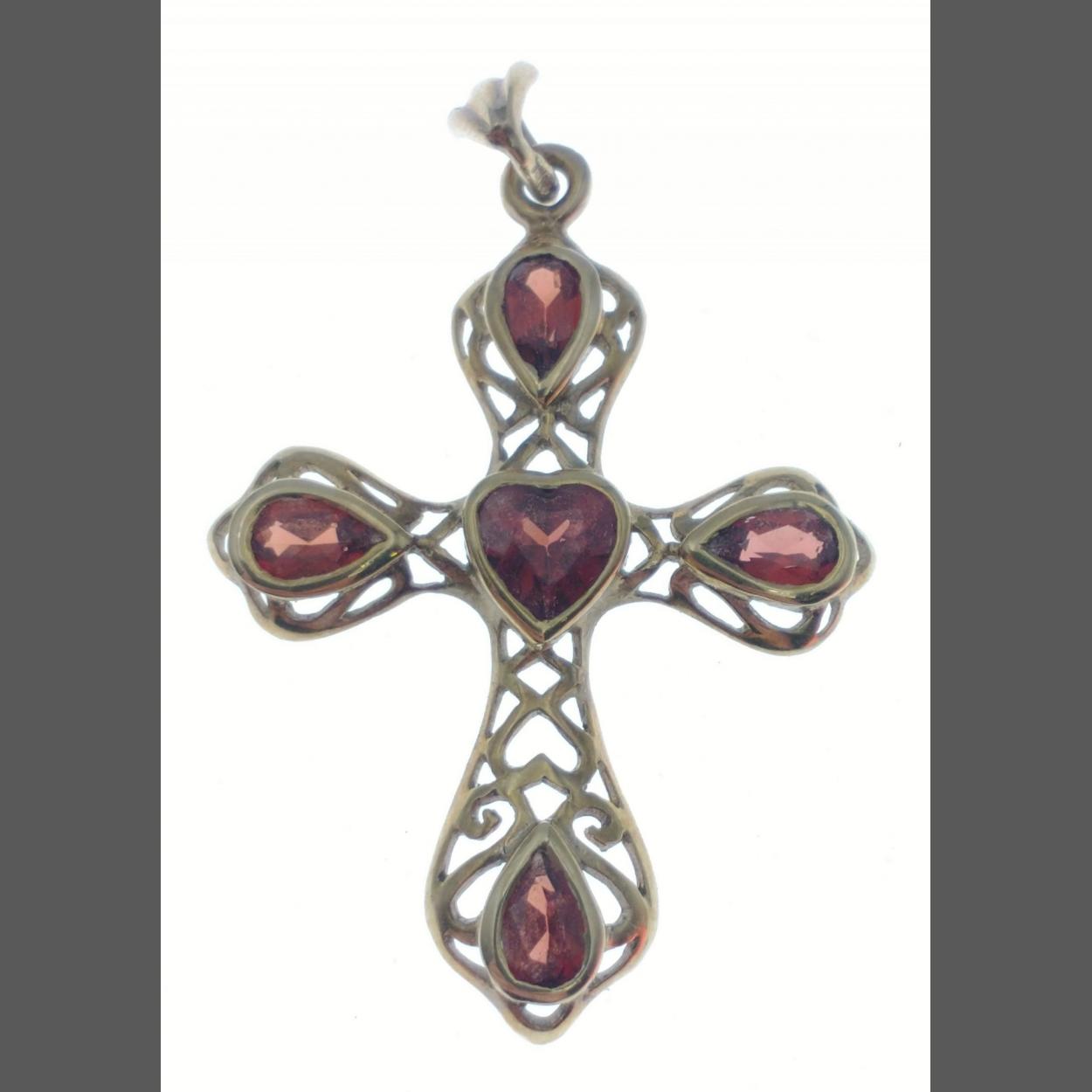 A 375 marked cruciform pendant, with 5 deep red garnet stones, 30mm approx, gross weight 2.3g approx