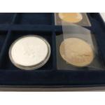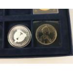 In a Westminster Mint box. A 2012 Five Pound Proof silver proof with certificate, an Alderney £5 proof from 2017 and two Guernsey cupro-nickel £5 with paperwork and in cases.
