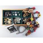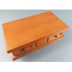 A NICE QUALITY two tier wooden jewellery box with an in-built mirror in the lid - and FULL of yellow metal and unmarked costume jewellery to include a bracelet, rings, a necklace, lots of earrings etc etc