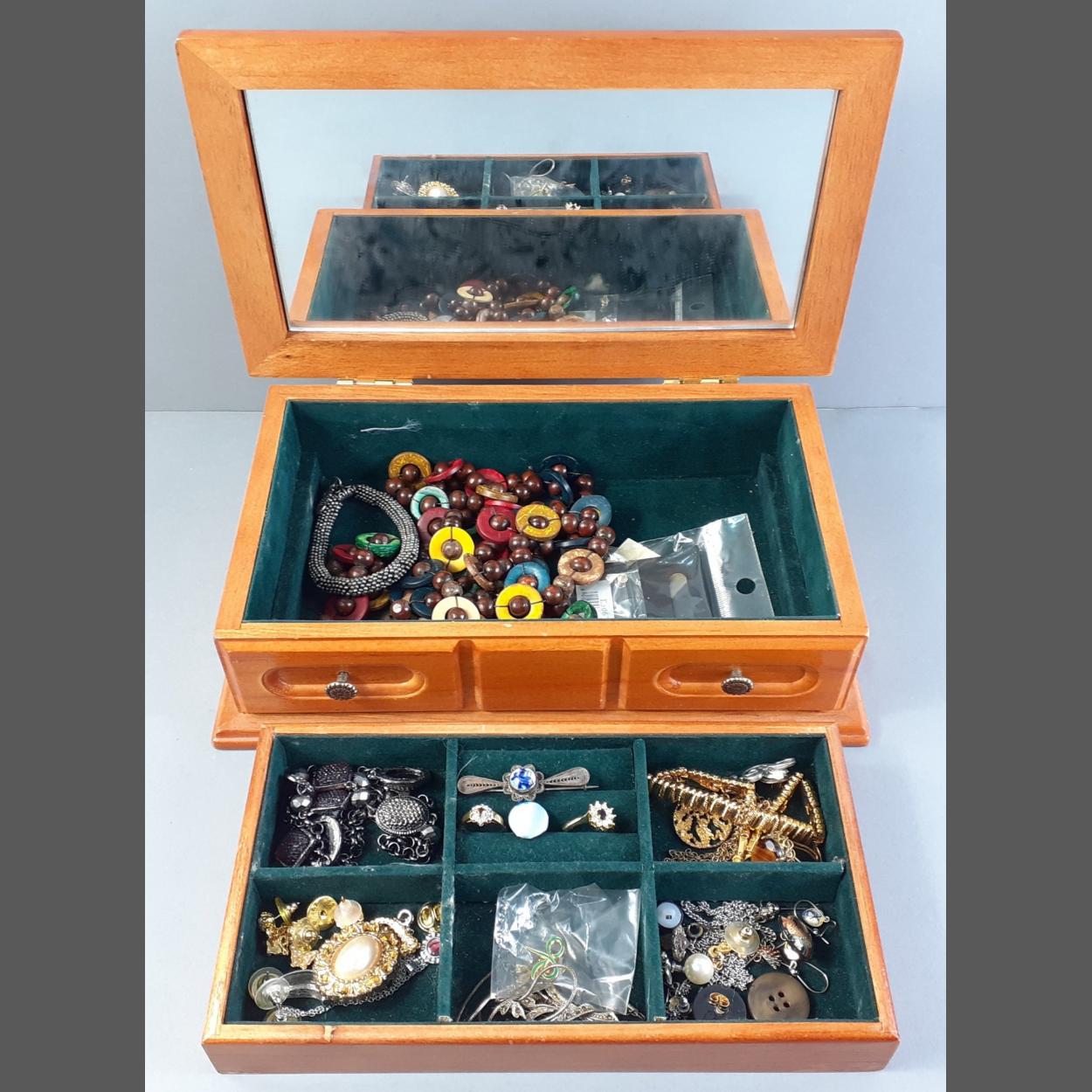 A NICE QUALITY two tier wooden jewellery box with an in-built mirror in the lid - and FULL of yellow metal and unmarked costume jewellery to include a bracelet, rings, a necklace, lots of earrings etc etc