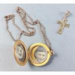 An ornate pierced 375 stamped yellow gold crucifix weight 1g approx with a costume unmarked yellow metal double locket with an unmarked yellow metal chain weight 9.54g approx