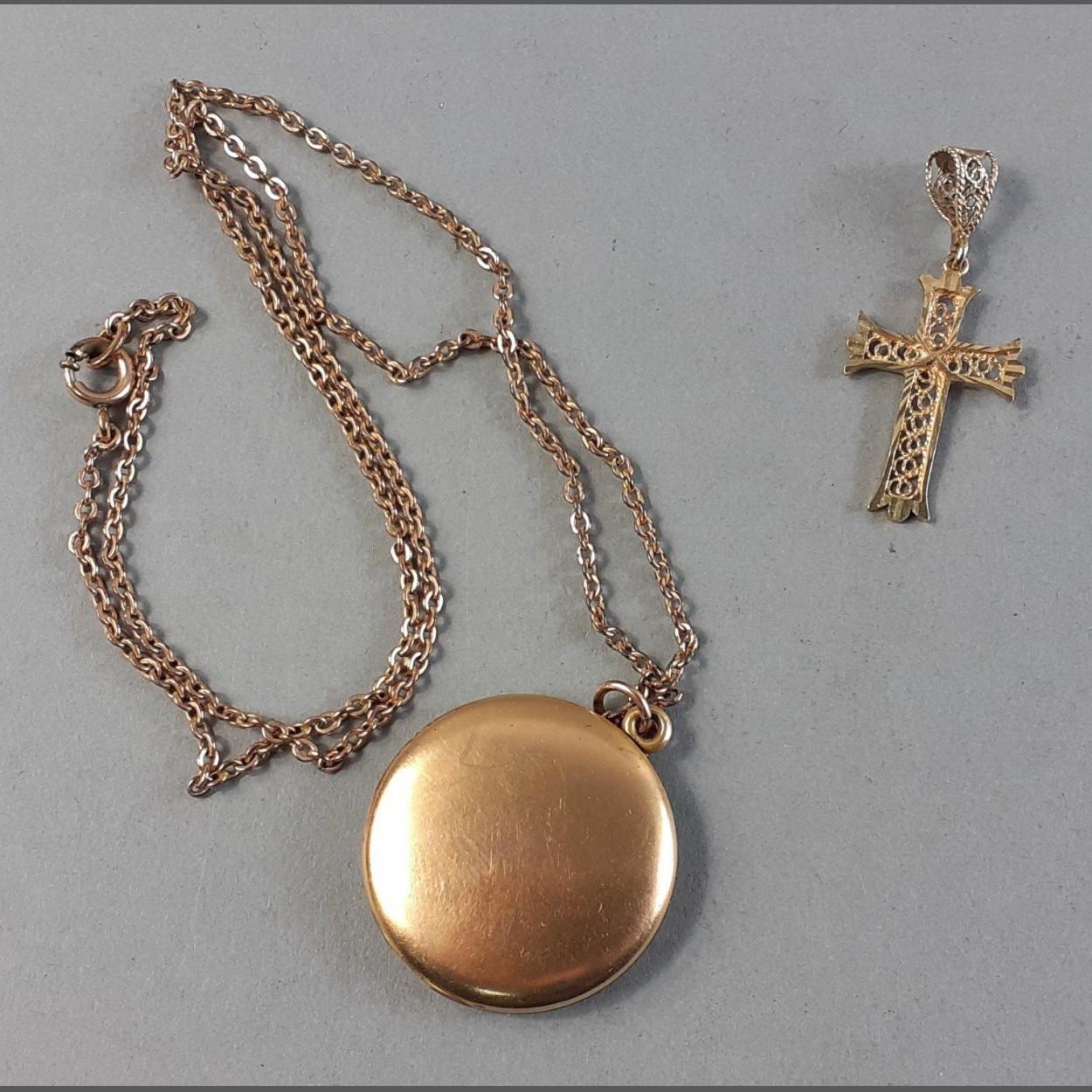 An ornate pierced 375 stamped yellow gold crucifix weight 1g approx with a costume unmarked yellow metal double locket with an unmarked yellow metal chain weight 9.54g approx