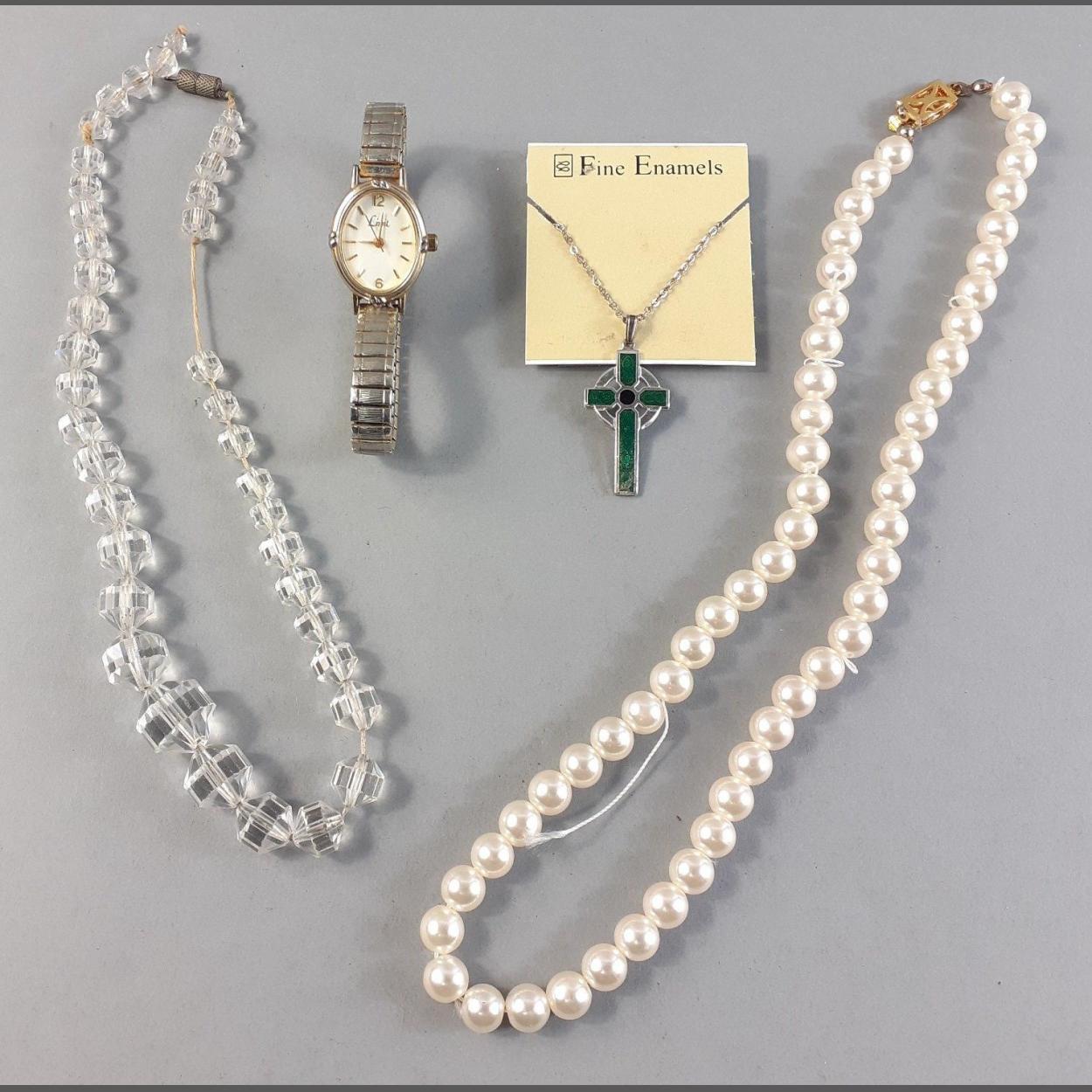 A set of faux pearls necklace, a vintage crystal glass necklace (requires a simple catch-repair), also a LIMIT ladies wristwatch with expanding bracelet and lastly a fine enamel Celtic Cross pendant