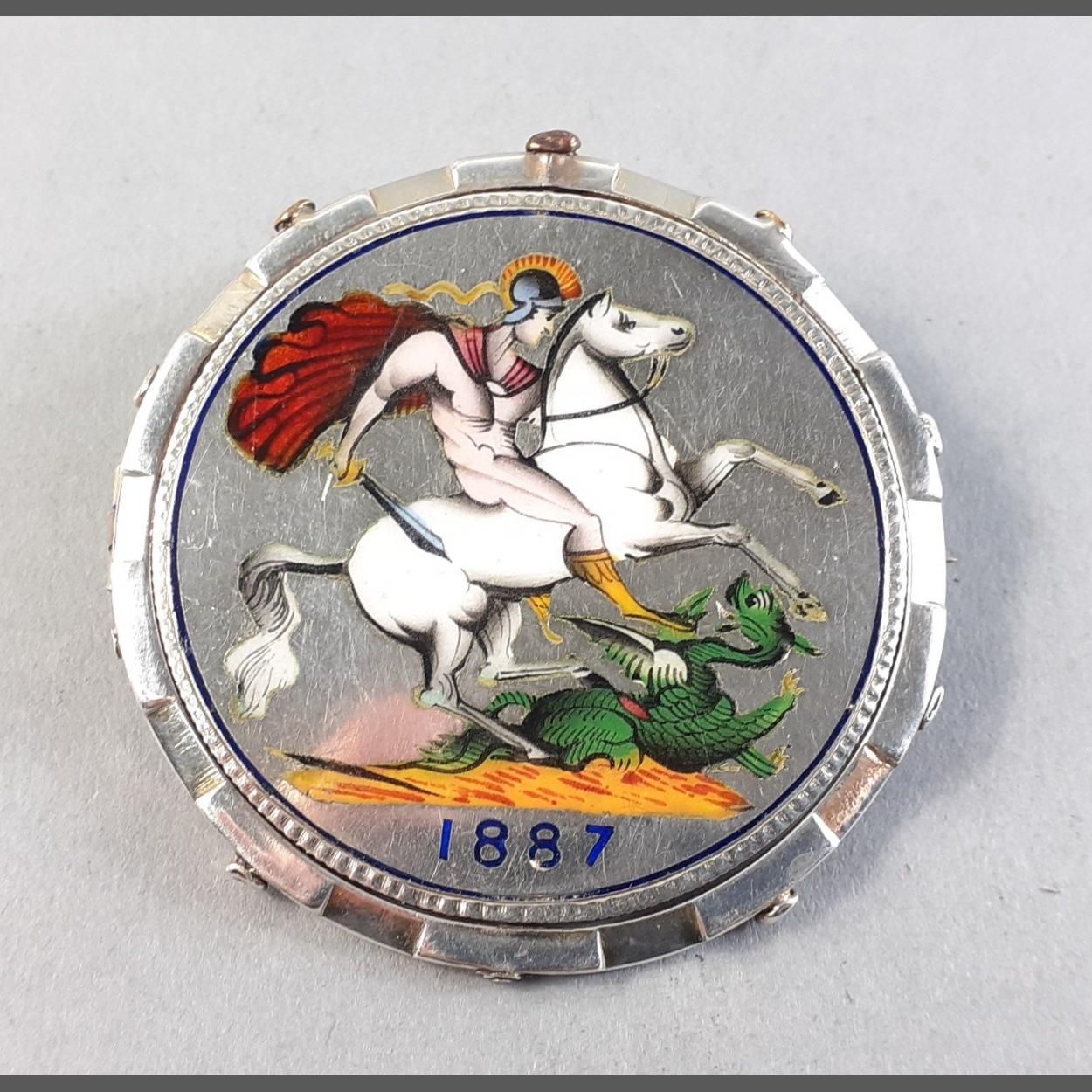 A lovely 1887 Victoria Crown enamelled reverse and presented in a fully hallmarked mount (Birmingham 1887). A nice example.