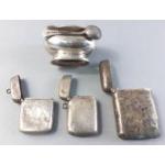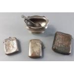 A small lot of four silver hallmarked items weighing 69g approx includes two vestas, a salt and condiment spoon. Also includes a small plated card case.