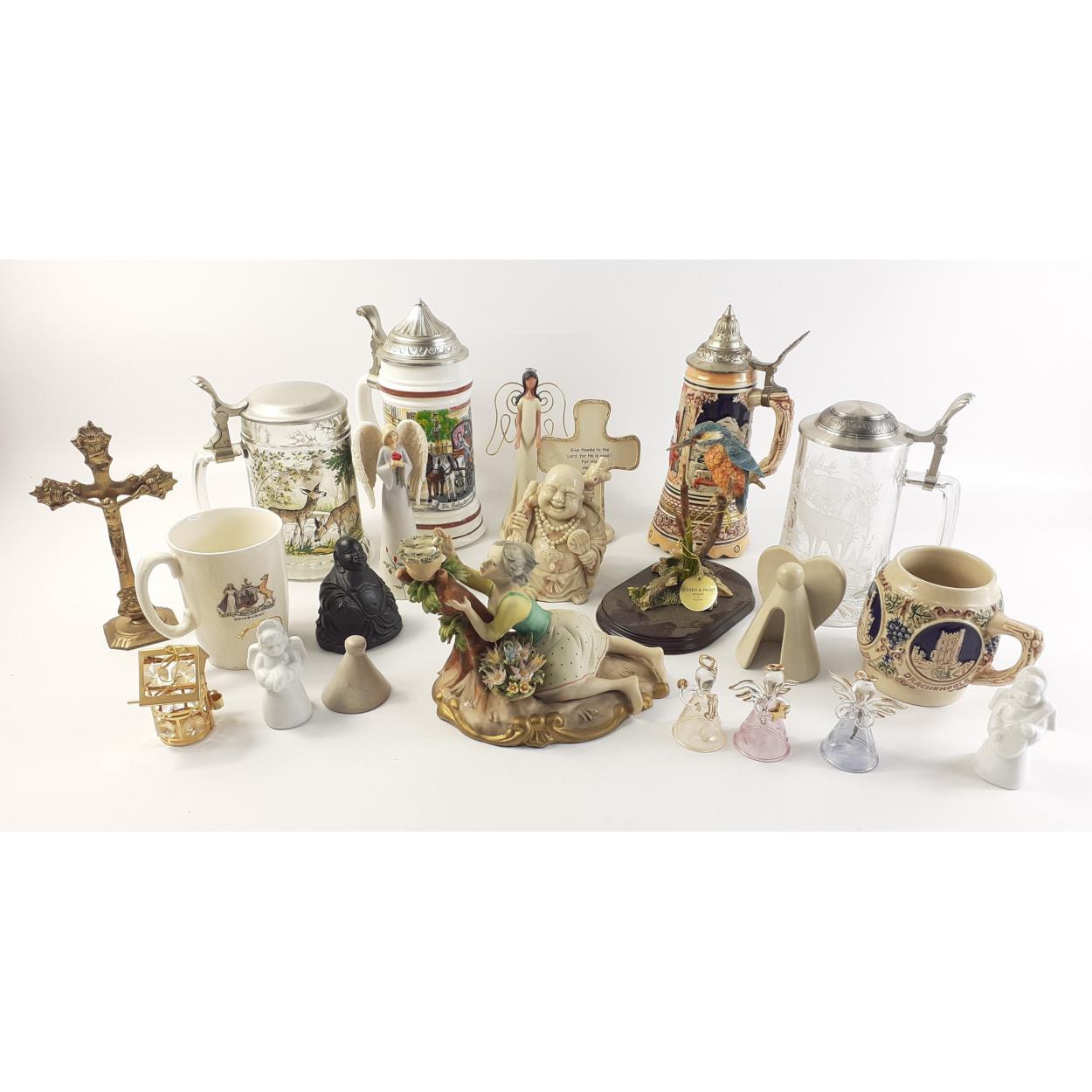 A small decorative lot to include 4 bier steins, small ornaments to include a Buddha, glass angel bells