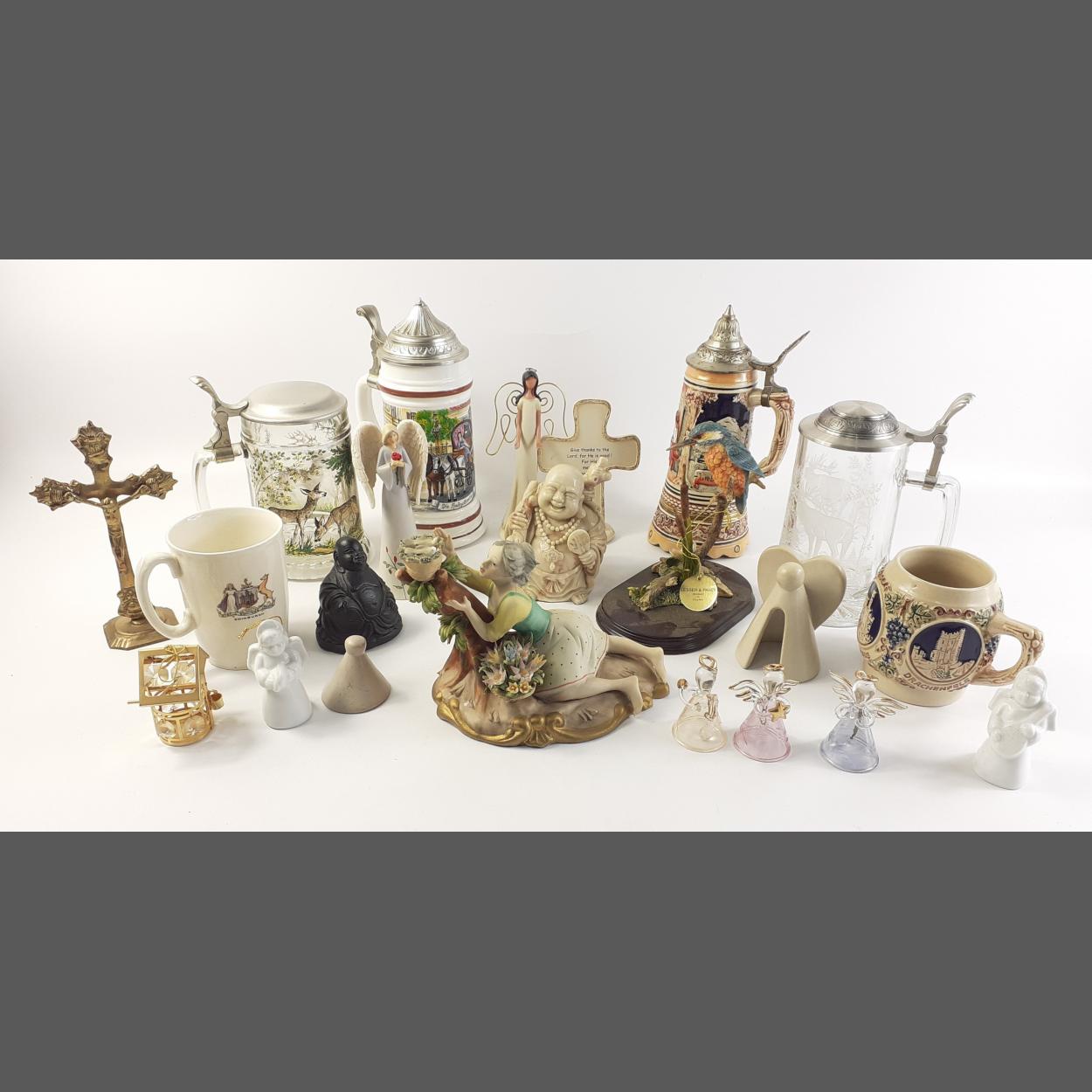 A small decorative lot to include 4 bier steins, small ornaments to include a Buddha, glass angel bells