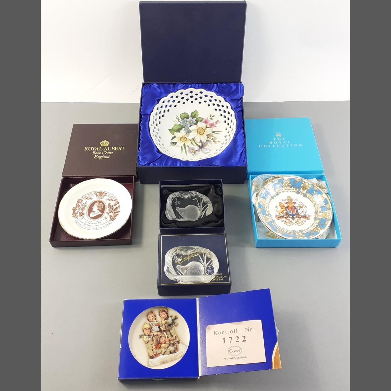 A small decorative lot to include a LEONARDO pierced dish, ROYAL ALBERT commemorative dish, other royal dishes, a HUMMEL dish, 2 DARTINGTON crystal animal pieces, mostly boxed