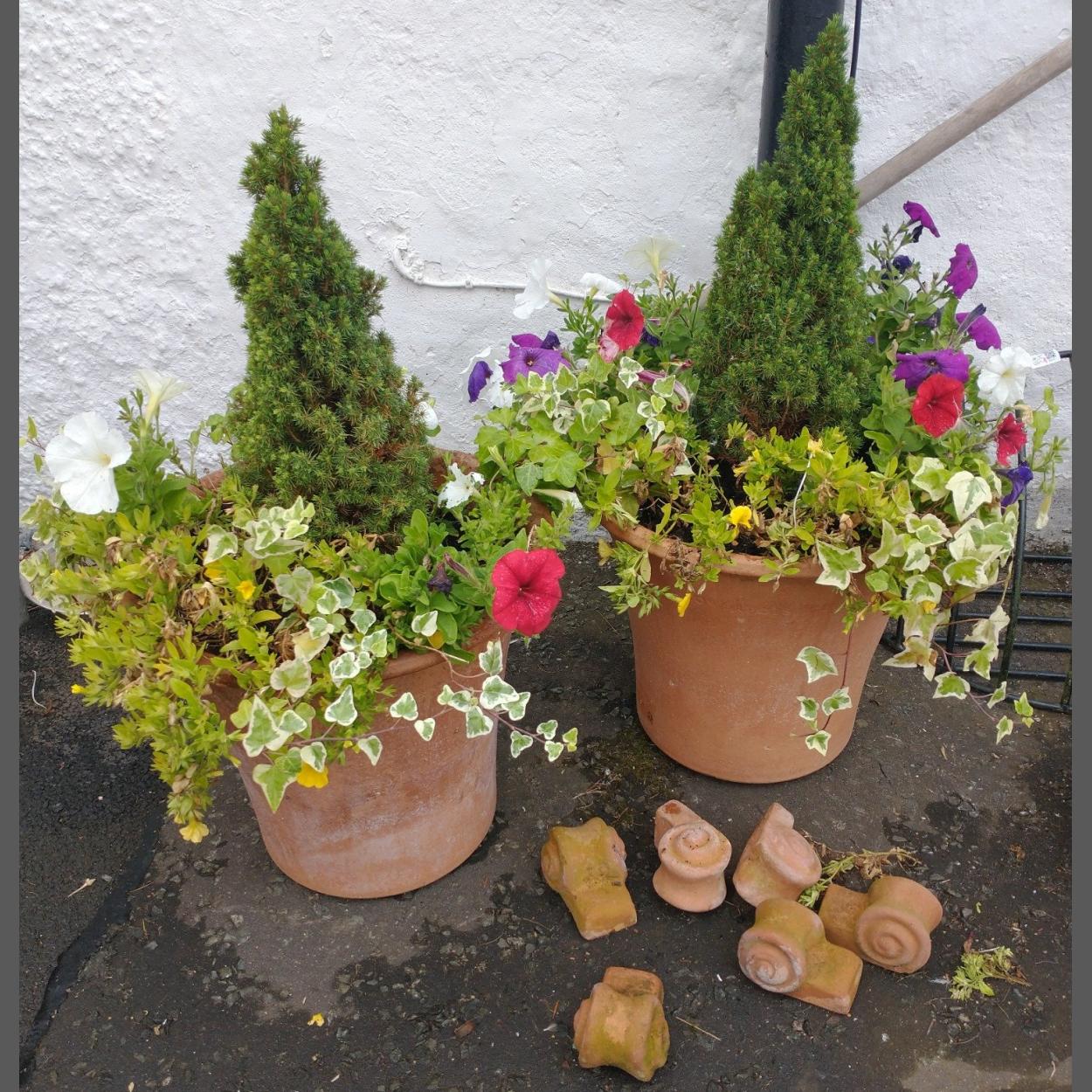 Two garden planters with feet and contents including flowers larger 39cm without feet