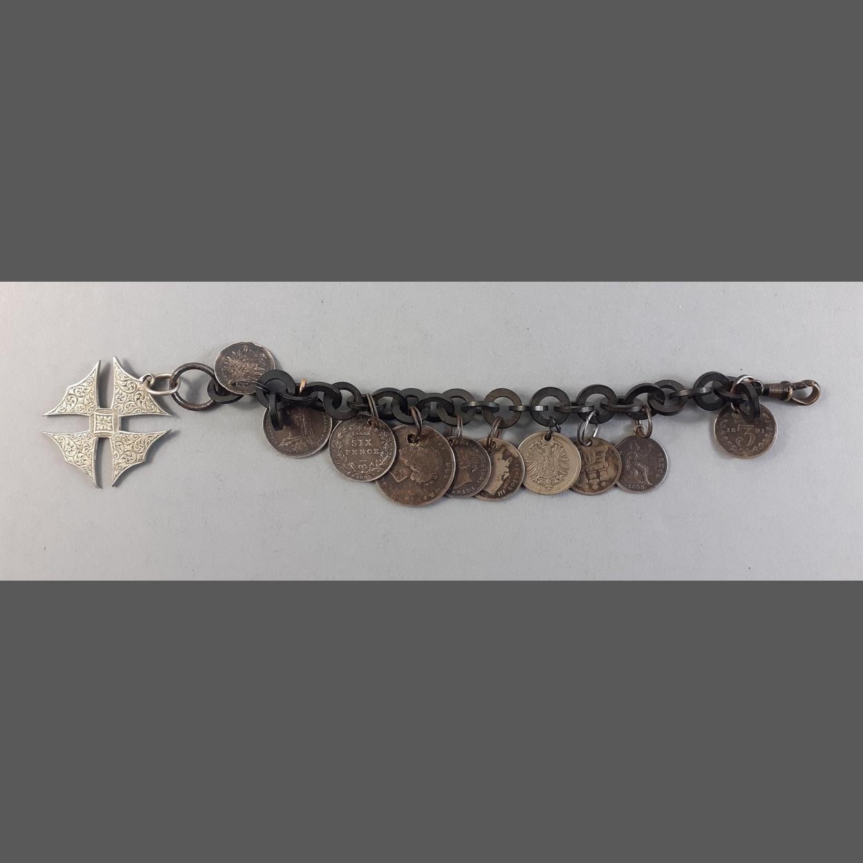 A small bracelet with a white metal Maltese Cross fob and ten holed silver coins. A pretty little thing.
