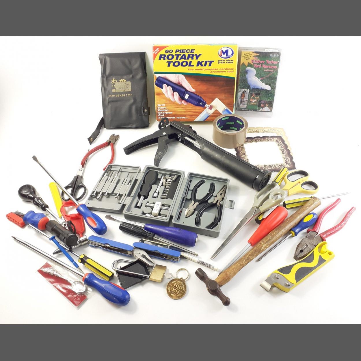 A bag FULL of mixed hand tools to include a silicon gun, a multi-tool set, a 60 piece rotary tool kit, a multi-folding box to contain pliers, fine screw drivers etc etc