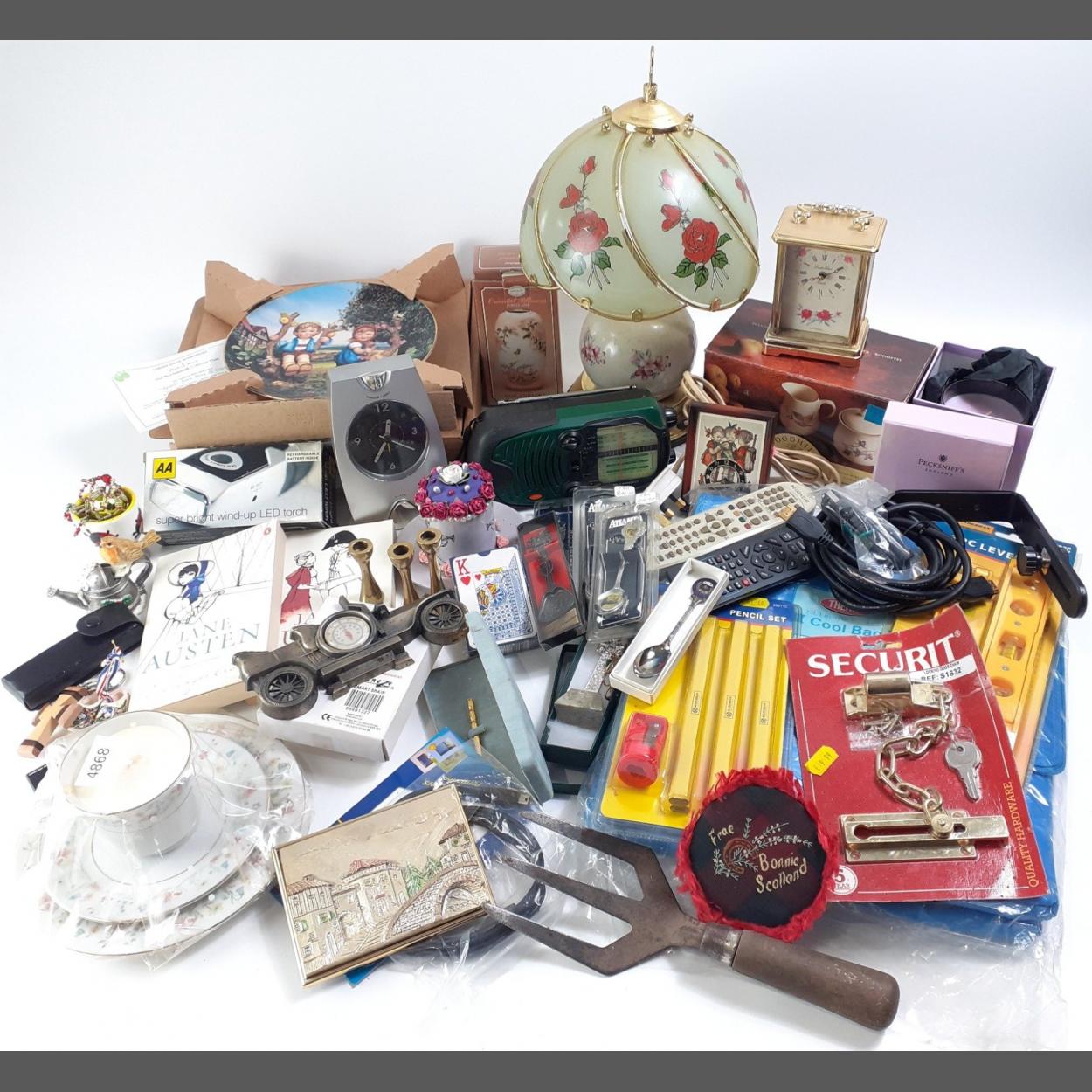 A mixed lot to include a cool bag, security chains, hand-held tools, a wind-up radio, candles, cups collectable decorative spoons, Hummel clock, and others
