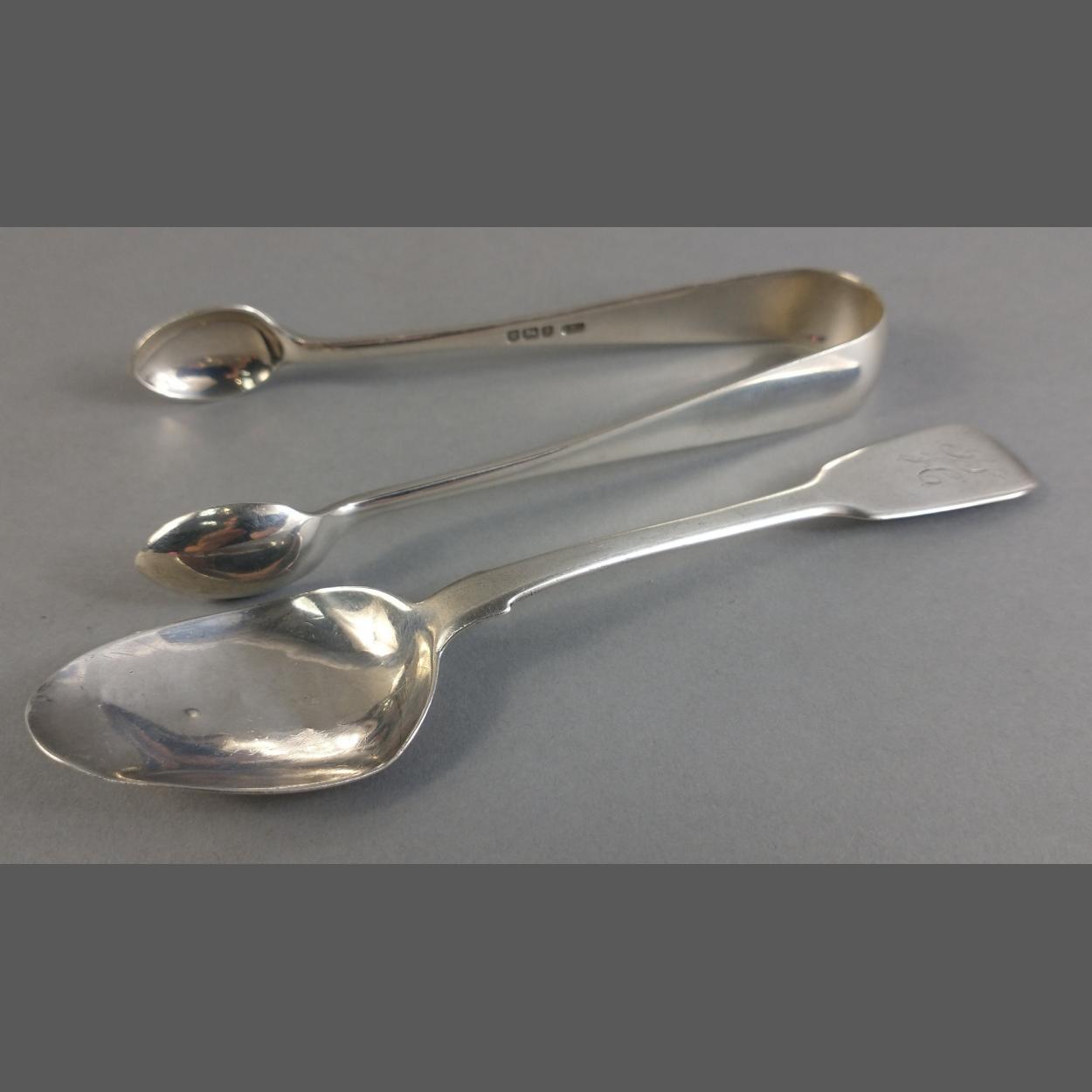 A small silver lot to include a Georgian teaspoon and a pair of Sheffield silver sugar nips. Weight 43g approx