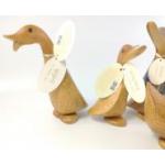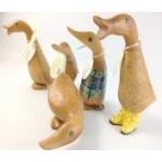 Five small wooden ducks by DCUK to include Herbie with the wellies (20cm approx), Ewan with tartan waistcoat, Herbie with no welly, Judith and one other