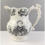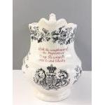 VINTAGE - HELP YER SEL! - two unusual decanters in blue glass and brown glass plus a ROYAL DOULTON GEORGE lV whisky water jug and a woven-basketed stone jug.
