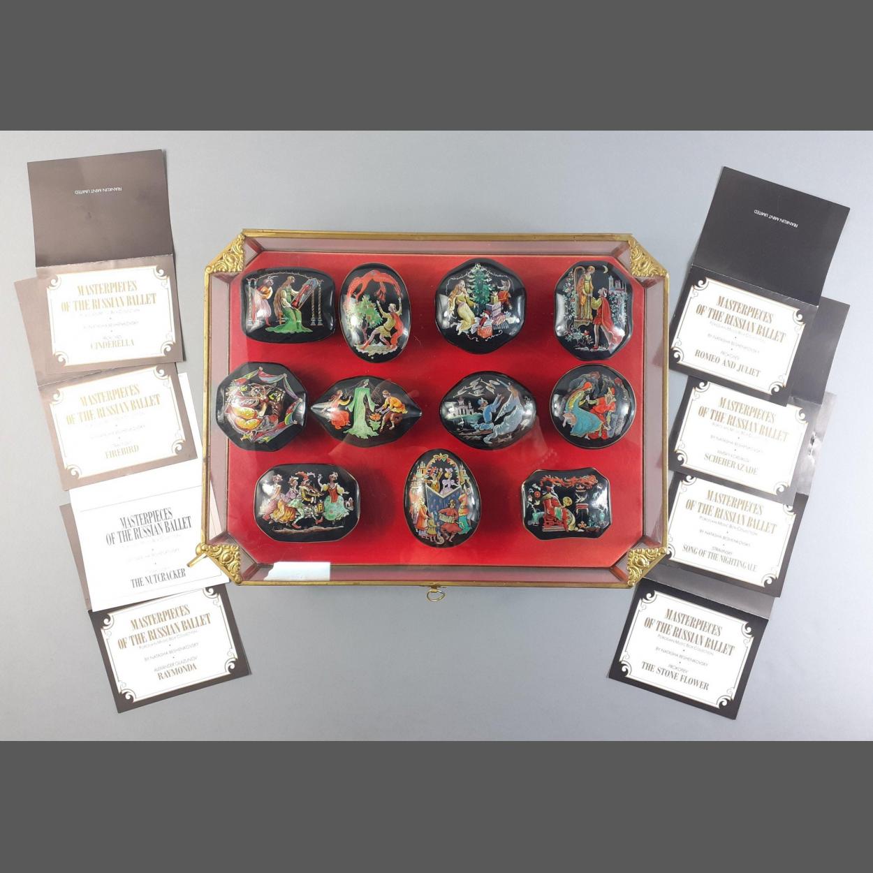 Franklin Mint Porcelain Music Box collection. Masterpieces Of The Russian Ballet. Eleven lovely pieces in excellent condition in display case.