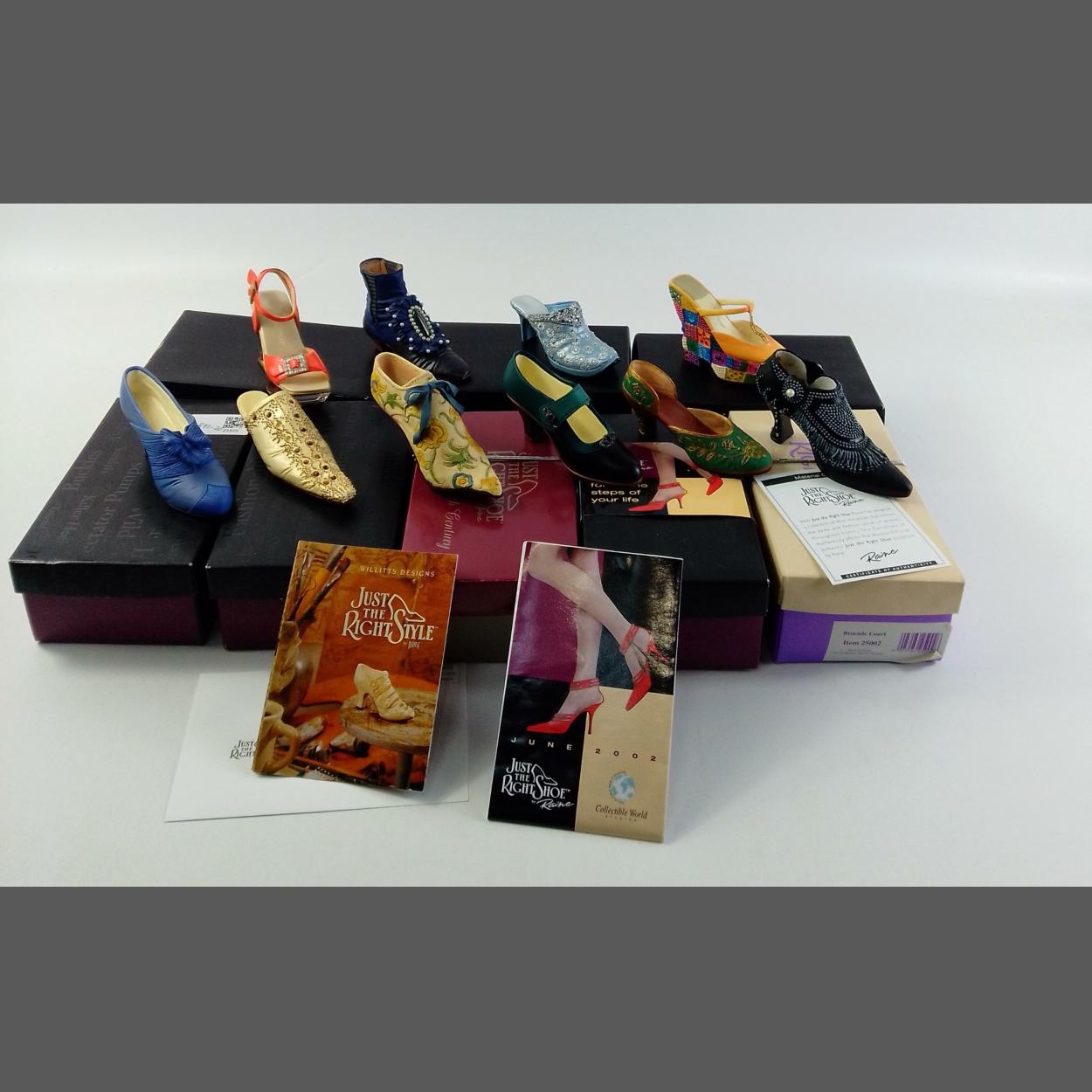A delightful collection of 14 Just the Right Shoe collectible line of miniature high-heeled shoes designed by RAINE, also known as Raine Willitts. These miniatures are highly detailed and very pretty.