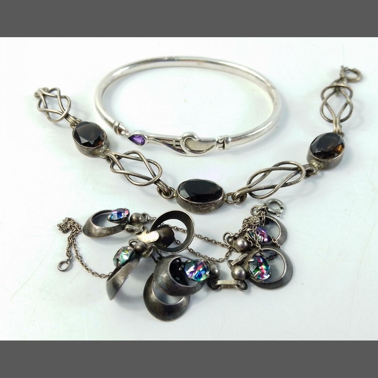 Small silver stamped jewellery lot to include lovely solid 925 stamped bangle with amethyst coloured stone and two bracelets. Total gross weight 43g approx.