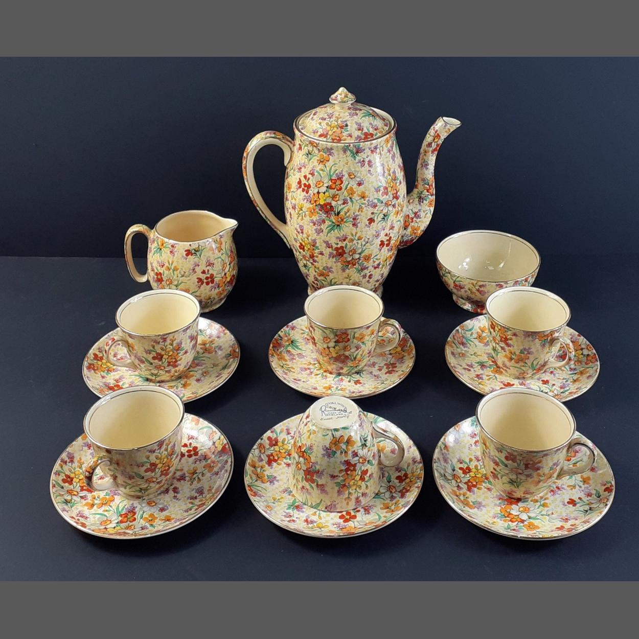 A ROYAL WINTON 'Sweet Nancy' coffee set to include 6 cups and saucers plus 1 coffee pot and 1 cream jug and 1 sugar bowl. No damage noted