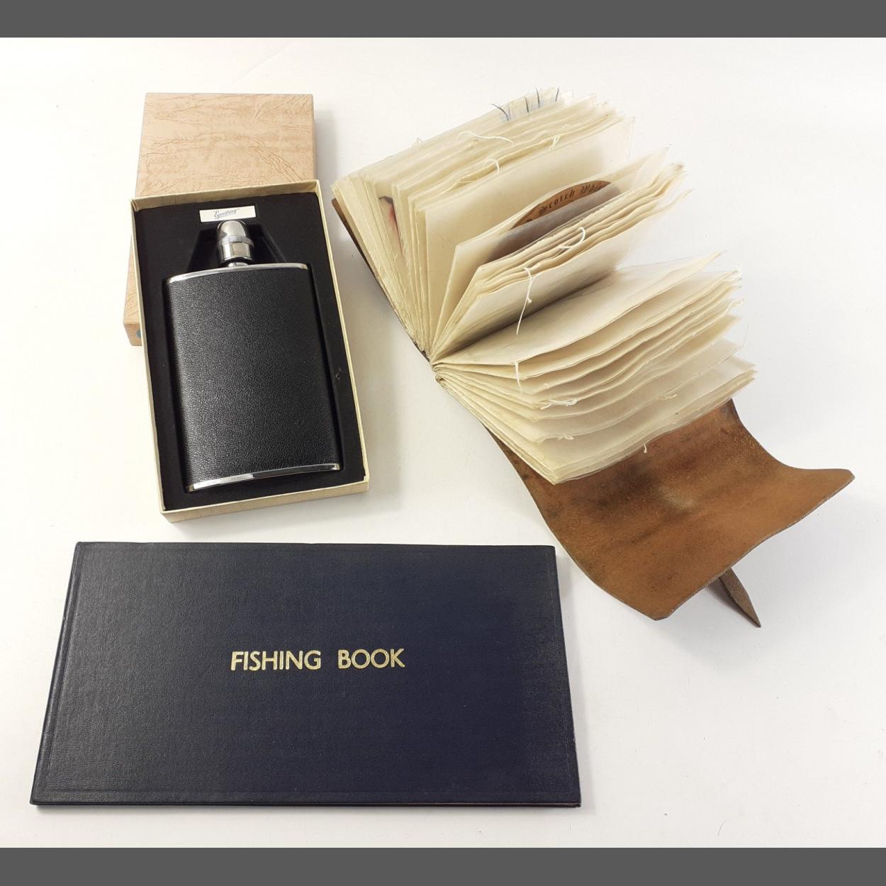 An unused Fishing Log book, a boxed unused flask and a vintage leather fly case containing a selection of trout and salmon flies some on traces.