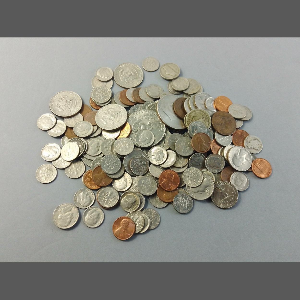 An interesting lot of mainly US coinage to include two Ike dollars, three later Kennedy halves, many dimes and quartes and a few Lincoln cents. Decent quantity.