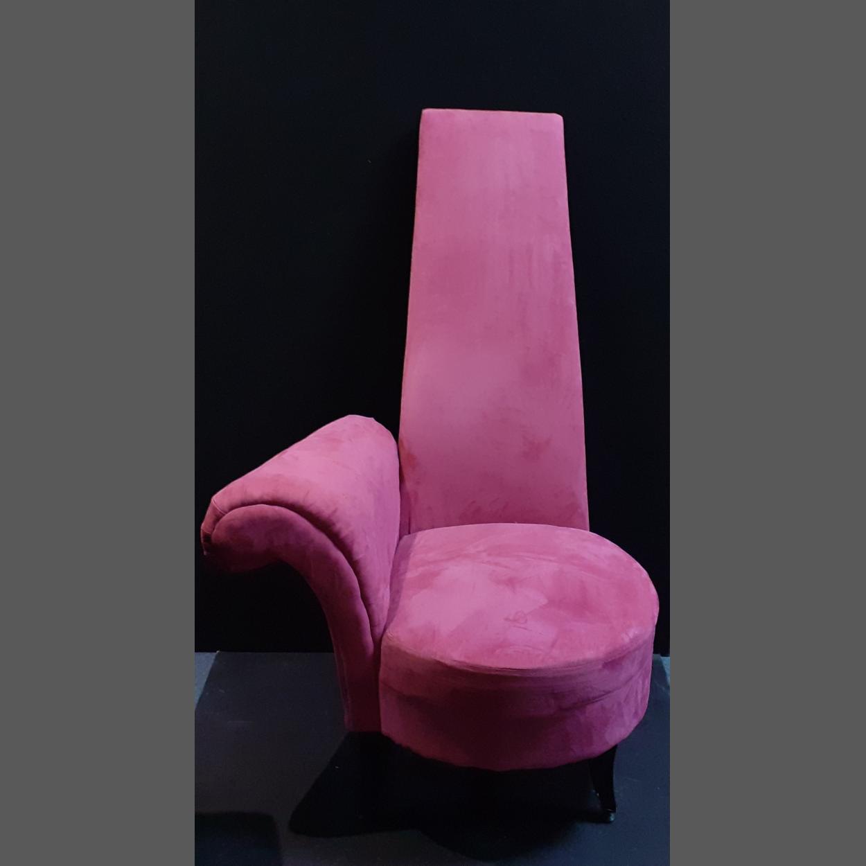 An unusual single arm pink velvet bedroom chair. In good condition. Stands 135cm at the back and 43cm to the seat approx.