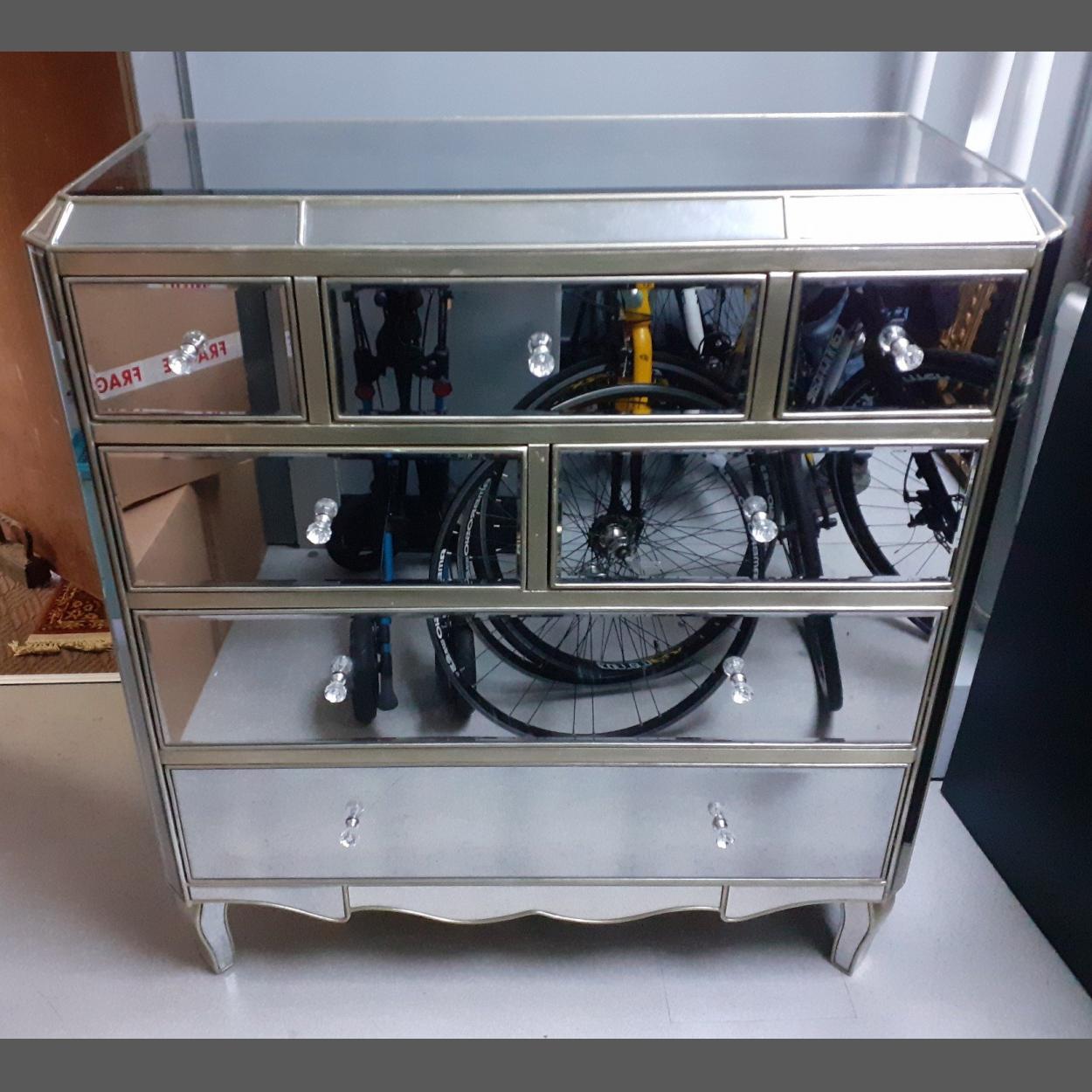 A seven drawer mirrored chest of drawers in good condition with one side panel cracked. Stands 115cm high, 102cm wide, 42cm depth approx.