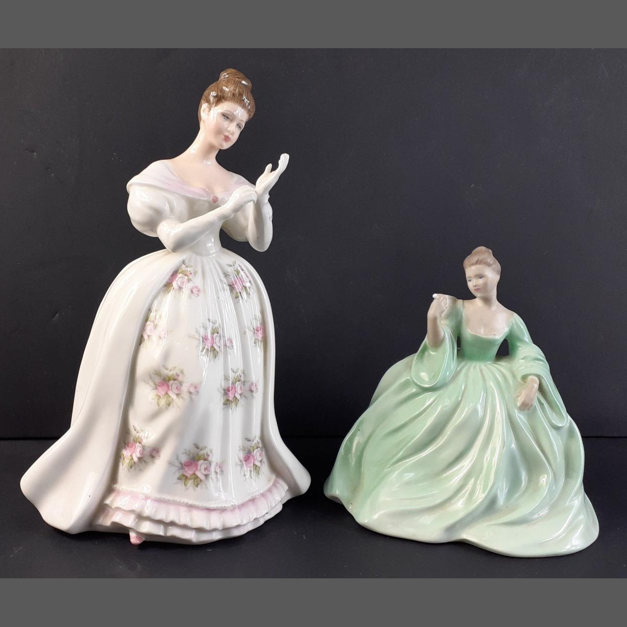 Two attractive figurines being ROYAL DOULTON Summer Rose (HN3309) 21cm tall and COALPORT Justine 14cm tall. No damage to either piece