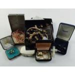 A pretty lot of vintage jewellery to include bracelets, and a pretty bow-shaped brooch in older retailer's box