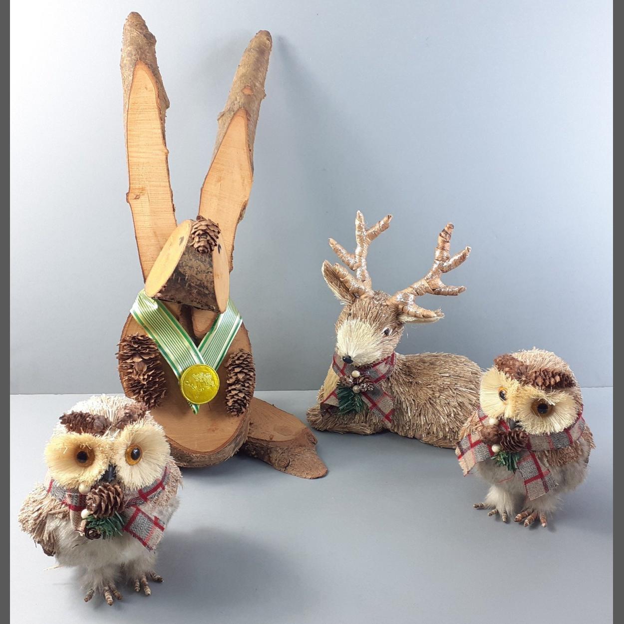 A collection of animal curios to include a tree log bunny dimensions height 47cm (garden ornament), a couple of owls and a deer by SHUDEHILL