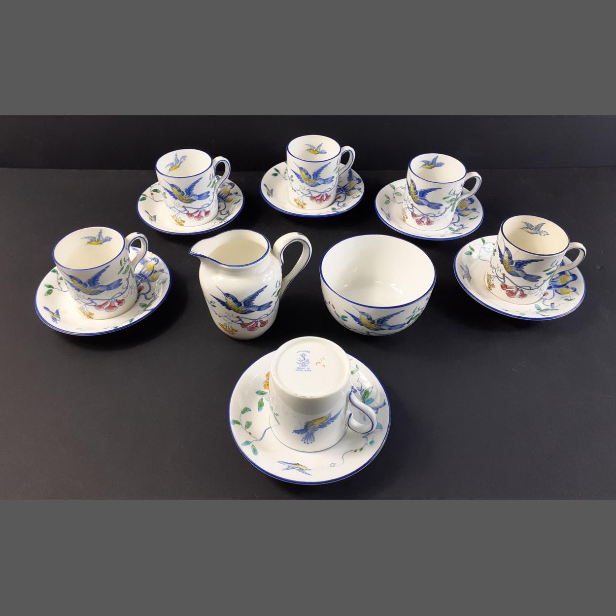 A small vintage CHELSON tea service in exceptionally pretty floral and bird pattern. Consisting of six saucers, five cups, sugar and cream. All pieces in generally good condition ,a small crack noted to one can.