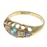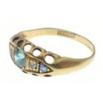 PRETTY RING! A 9ct stamped yellow gold ring size L with an aqua marine stone centred and flanked with 2 small diamonds (tested) - gross weight 1.84g approx