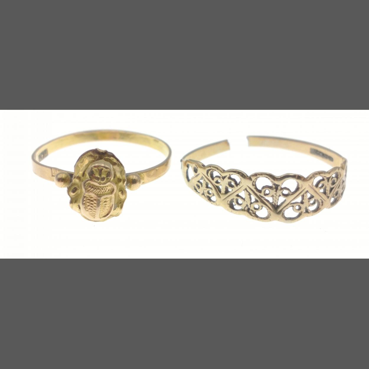 A faintly 375 stamped scrap gold ring 1.27g approx with an EGYPTIAN Scarab Beetle stamped ring- ring size S, weight 1.61g approx