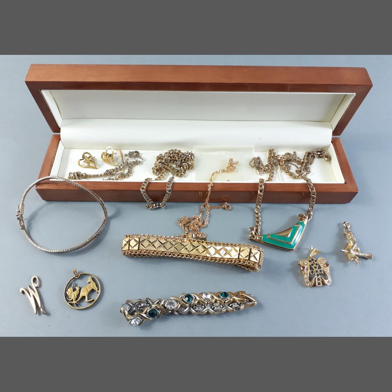 A quality wooden watch or necklace box with some gilt bling jewellery pieces. An interesting lot.