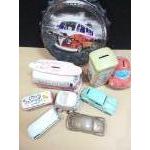 VOLKSWAGEN LOVERS - A VOLKSWAGEN split screen battery wall clock (looks cool!) with also two ceramic piggy banks, one Volkswagen camper van a beetle - with two model Volkswagens by Ada, etc