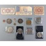 Interesting 1887 Victorian silver half crown in loose mount with a ROUBAIX 1910 French Exhibition medallion and some UK Crowns. Also two WWII era occupation banknotes and a Irish £5 note