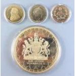 A collection of gold plated coins. Interesting lot, looks like a million dollars! Includes a huge 10cm QEII coin , a Kruggerrand and two other commemorative pieces.