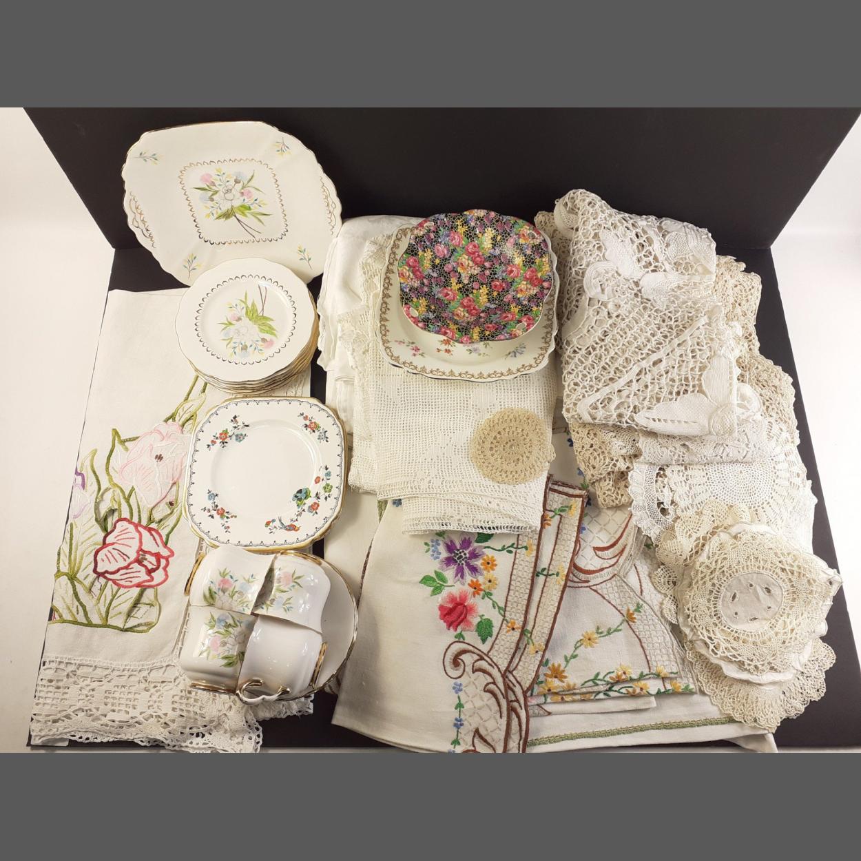 A mixed lot to include a quantity of linen including damask tablecloths, doilies, embroidered cloths. Also a small quantity of china with a part tea set and others
