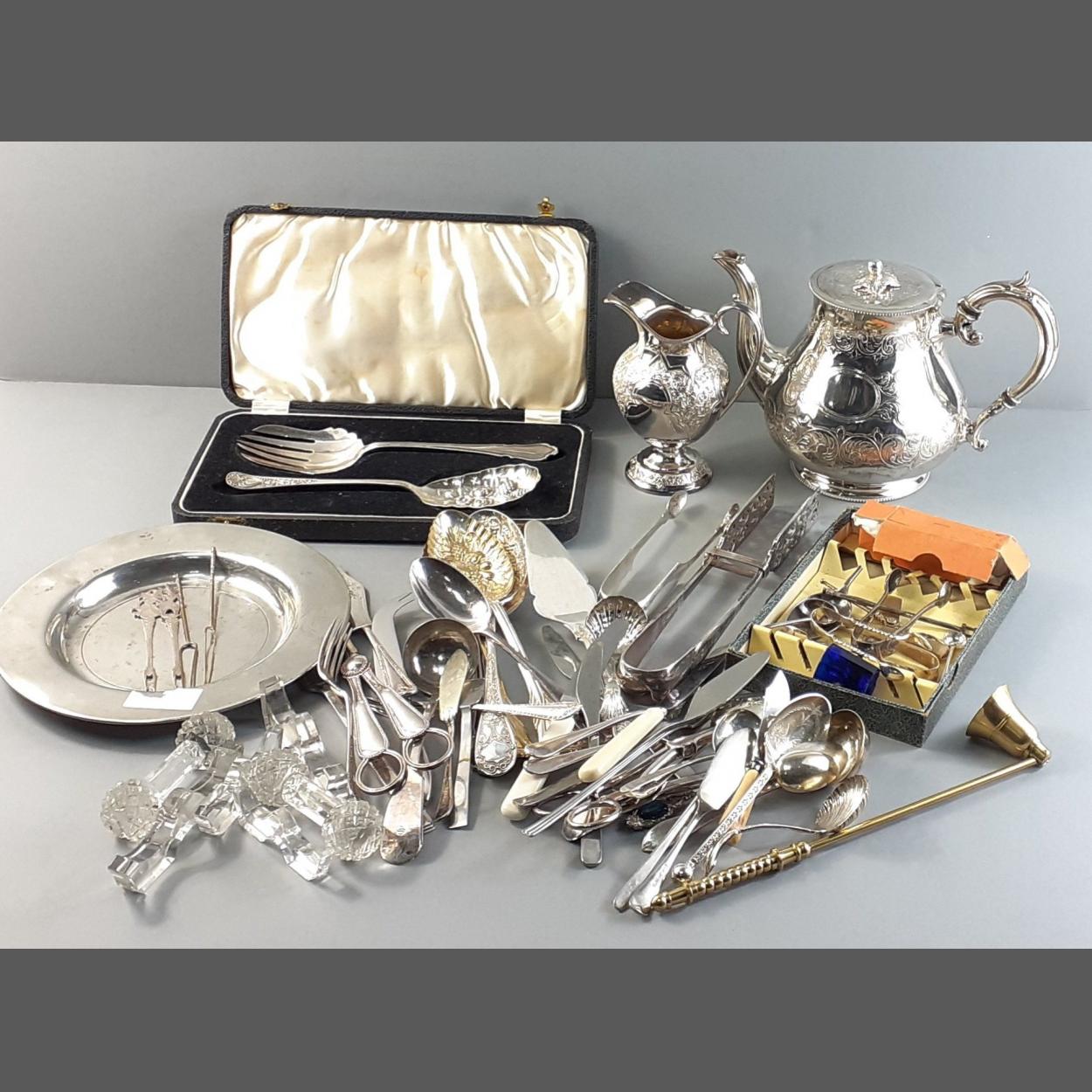 A super box of EP items to include a lovely old pewter dish, EP teapot, boxed cake set, knife rests and much else.
