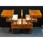 A wooden cantilever sewing box with five different storage compartments. In overall good condition. Standing 56cm tall approx including the handle - approx 50cm wide - approx 26cm depth. Comes with contents.