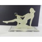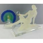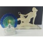 Two modern resin and glass decorative ornamental figures, one depicting a peacock, the other resin one a seductive model - holding a ball - dimensions length 46cm x 25cm tall approx