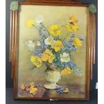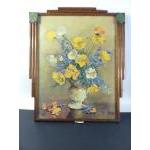 A still life print within an elaborate early 20th century oak Arts & Crafts frame 50x42cm approx