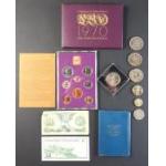 A small collection of COINS of interest to include a very clean 1970 Royal Mint year set complete with documents and a decimal set. Includes two £1 banknotes, crowns and others