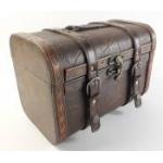 A treasure chest of a jewellery box, wooden construction with leather straps measuring 26x15x18cm approx. Includes contents of quality costume jewellery, mainly beaded necklaces. Some interesting items