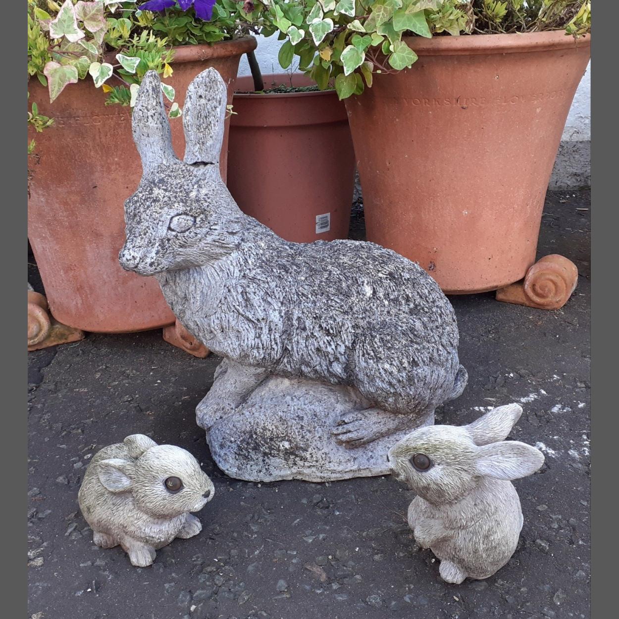 Three animal garden ornaments to include two resin bunnies and a stone effect resting large bunny (left ear requiring repair)!