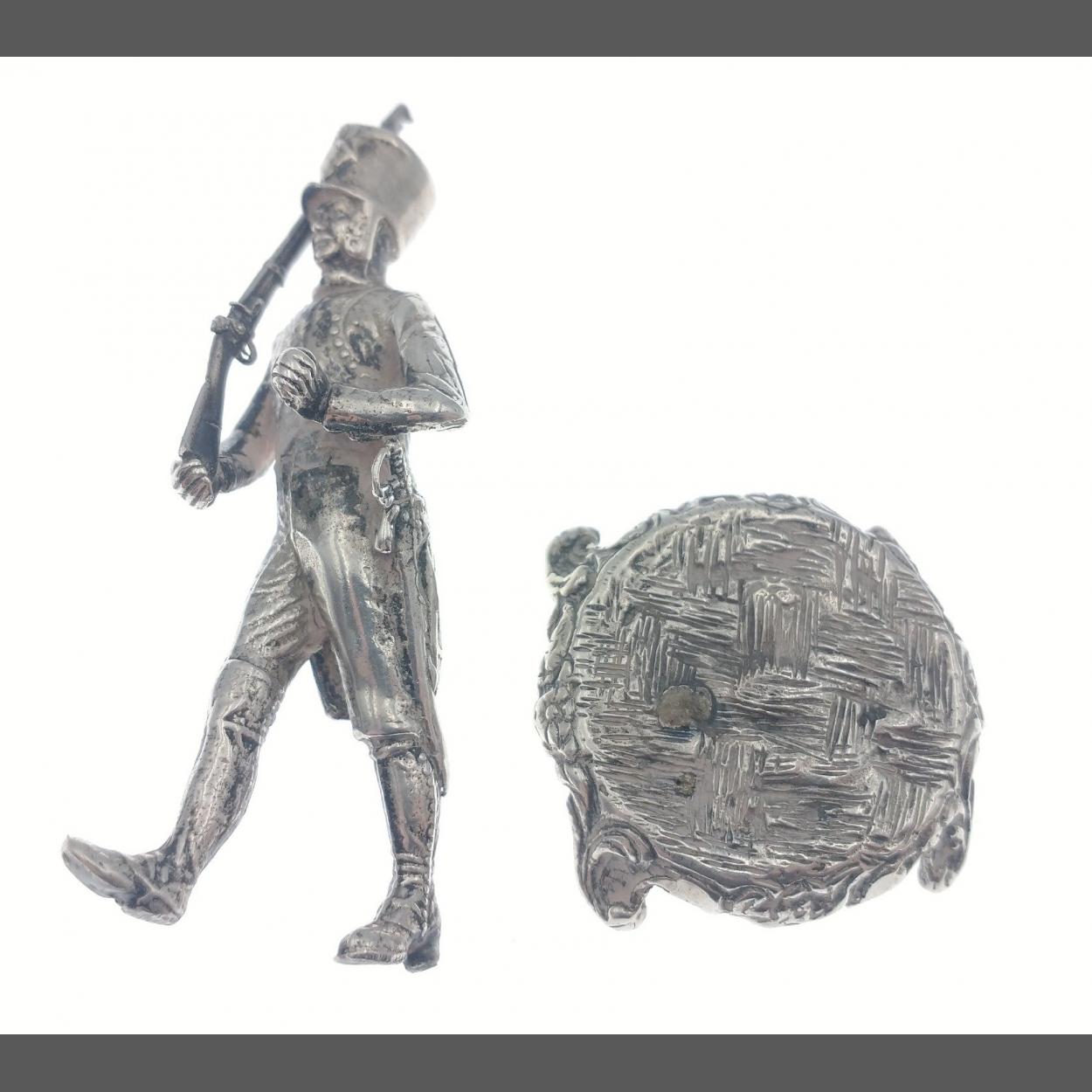 A very well sculpted sterling silver hallmarked model of a Napoleonic era rifleman. 7cm tall approx, weighs 50.6g approx. The model is detached from the base. Indistinct hallmark, London, likely 1980s