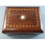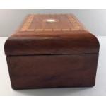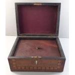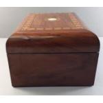 An exceptionally attractive desk top stationery or storage box with beautiful inlay finish. Fully working lock with key. Measures 30cm x 14cm x 21cm approx. In very good useable condition with no missing inlay.