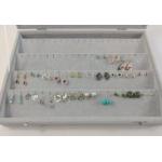 A pearl grey four row earring display case (33x23cm approx) with clear lid, containing many pairs of earrings set with multi-coloured stones