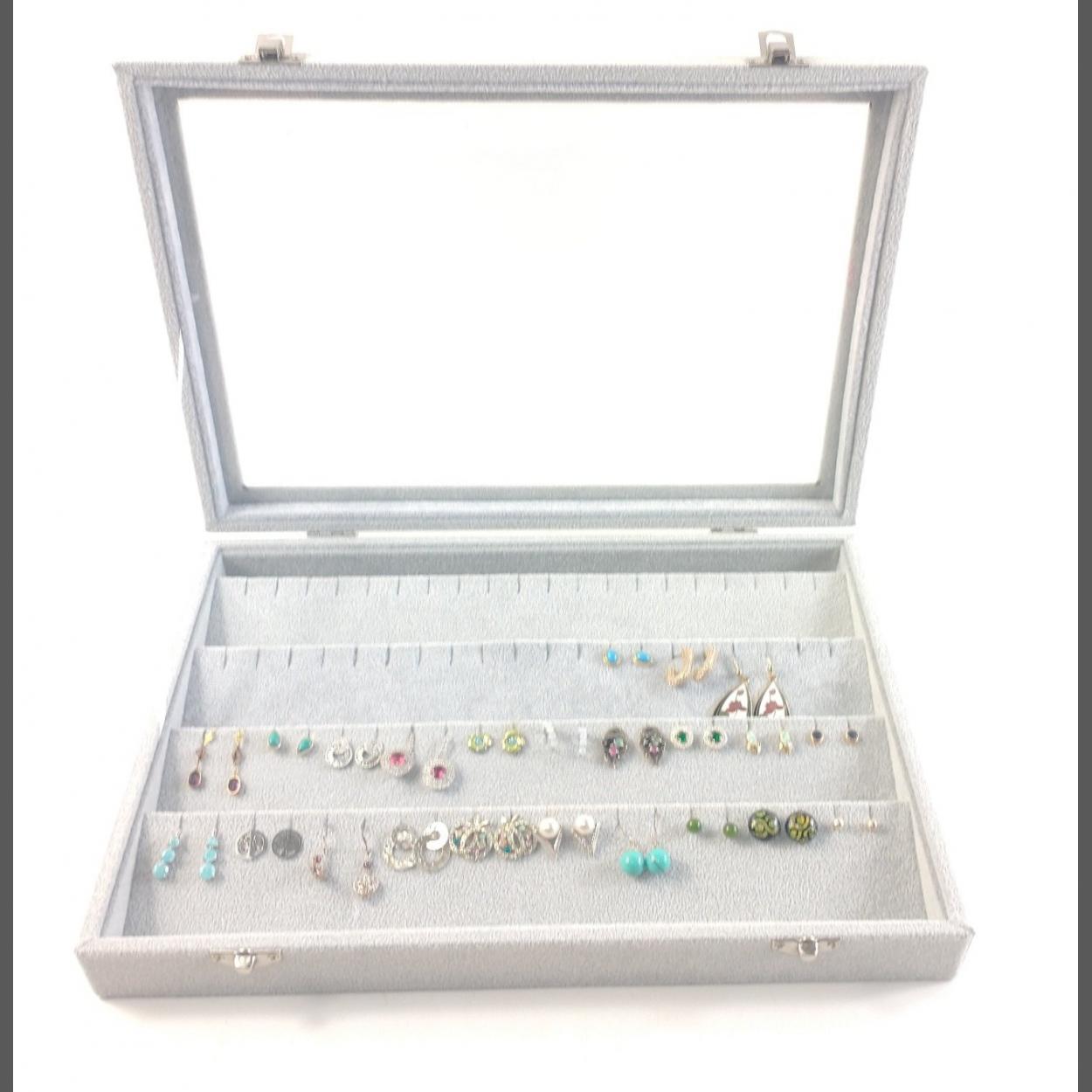 A pearl grey four row earring display case (33x23cm approx) with clear lid, containing many pairs of earrings set with multi-coloured stones